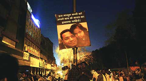 ‘This little girl wants justice for her father’ reads a poster bearing a photograph of Shahnawaz with his daughter. (Source: Express photo by Praveen Khanna)