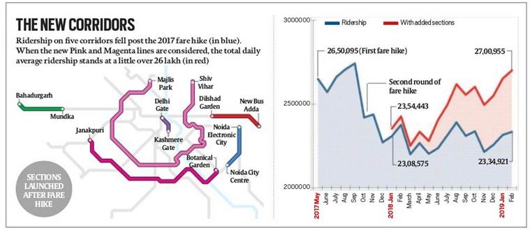 Consider this: In May 2017, when fares were hiked after eight years, five operational corridors of the Delhi Metro were carrying 26.50 lakh passengers daily. Nearly two years later, which included a second round of fare hike in October 2017, the same corridors — spanning over 210 km across Delhi and its adjoining satellite towns — registered a daily average ridership of a little over 23 lakh in the first two months of 2019.
