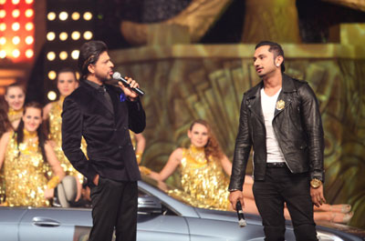 A Rap artiste without a bevy of hot women by his side is not hip hop enough. And Yo Yo Honey Singh, the rising star of the music industry did not disappoint with his grand entry by riding in a convertible on stage and an entourage of women. Shah Rukh Khan asked him what his parents wanted him to become and Singh responded by crooning his biggest hits. For a newbie, Singh held his own with SRK.