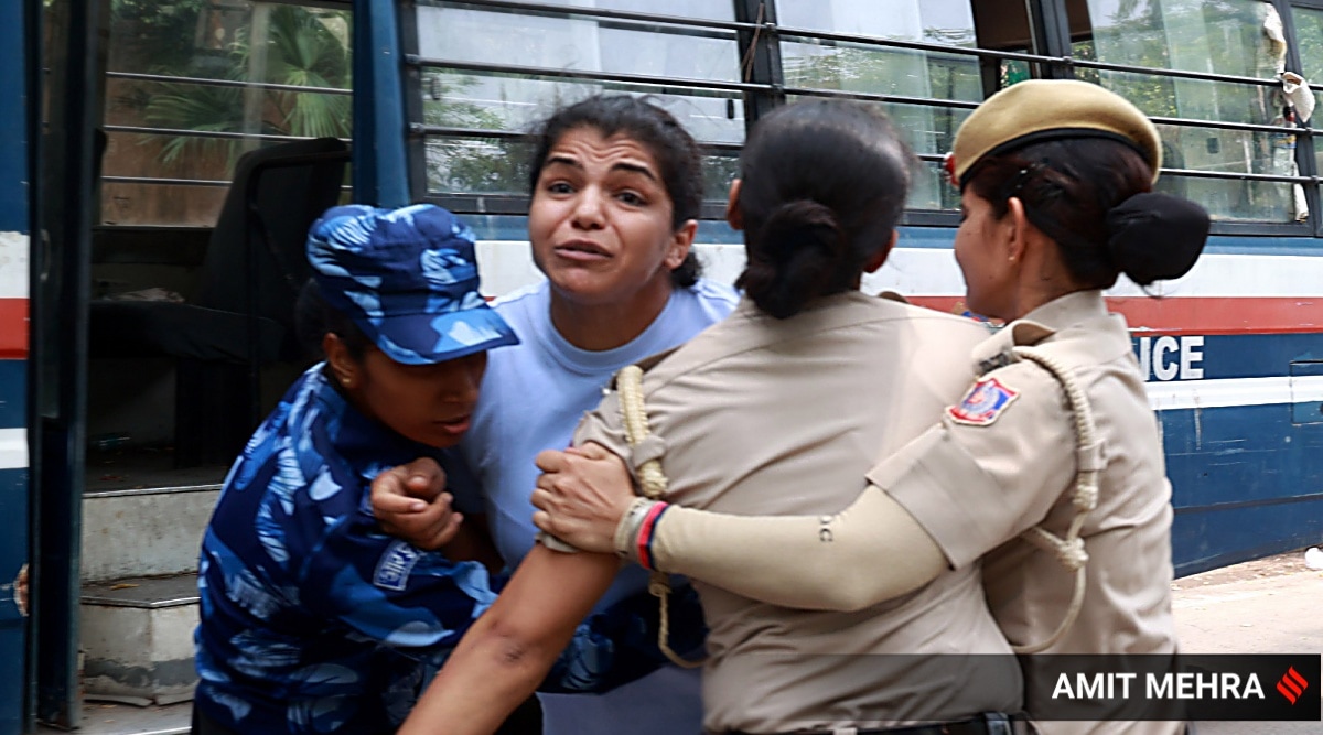 Police detain Sakshi Malik, an Indian wrestler during wrestlers protest against Wrestling Federation of India (WFI) chief Brij Bhushan Sharan Singh, in New Delhi, Sunday, May 28, 2023 (Express Photo By Amit Mehra)