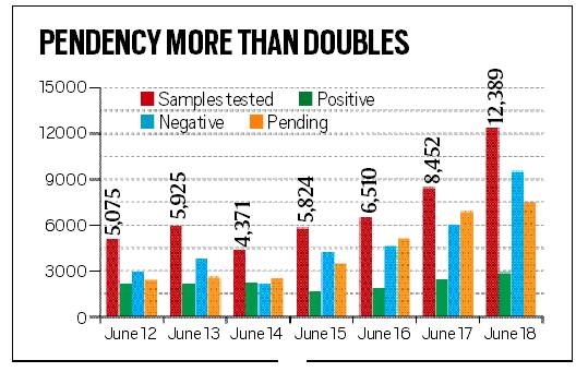 As per health department data, the number of samples collected by the government pending at various labs were 3,478 on June 15; 5,116 on June 16; 6,892 on June 17; and 7,439 on June 18.