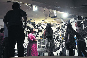 Megha Katyal creates a labour-intensive Zen dream-house constructed entirely from woven yarn while Garima Jayadevan has made an enclosure covered in tiny mirrors shaped like the stone jalis of old buildings. I bring together the sacred and secularthe enclosure will be lit to evoke the dazzling effect I witnessed when thousands of diyas were lit during Diwali. I felt it again when I was hit by the white light at the Delhi Metro, says the Mumbai-based artist.