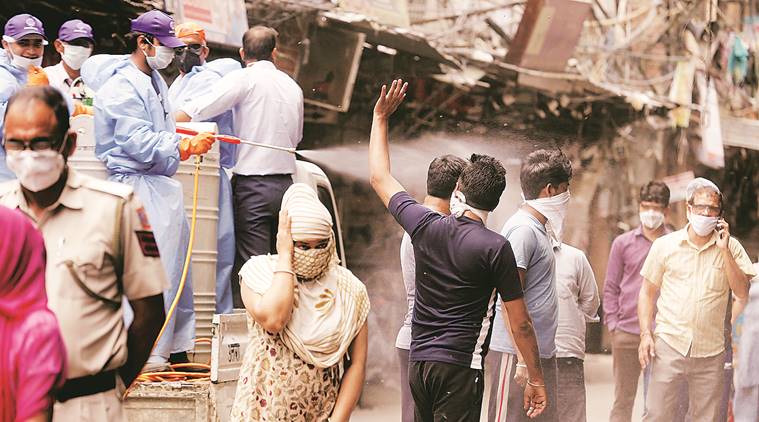 Sanitisation work at Chandni Mahal in Old Delhi last month. The doubling rate in the Central district is 9.5 days, less than the national average of 12.2 days. (Express Photo by Amit Mehra)