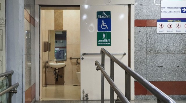 To guide transgenders to these toilets, bilingual signages (English and Hindi both), along with symbols for both categories -- 'Persons with Disability' and 'Transgenders' -- have been installed adjacent to these toilets. (Express Photo)In a bid to provide a safe space for transgenders and prevent discrimination against them, the Delhi Metro has now opened up toilets meant for people with disabilities to transgenders as well, said a spokesperson of the Delhi Metro Rail Corporation (DMRC).