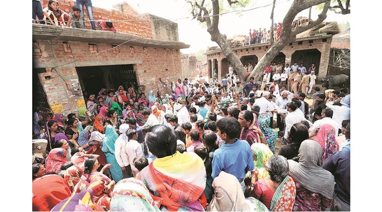 Locals at Nai Basti village after Ram Narayan Yadav’s body reached his home on Monday. (Express Photo by Vishal Srivastav)
