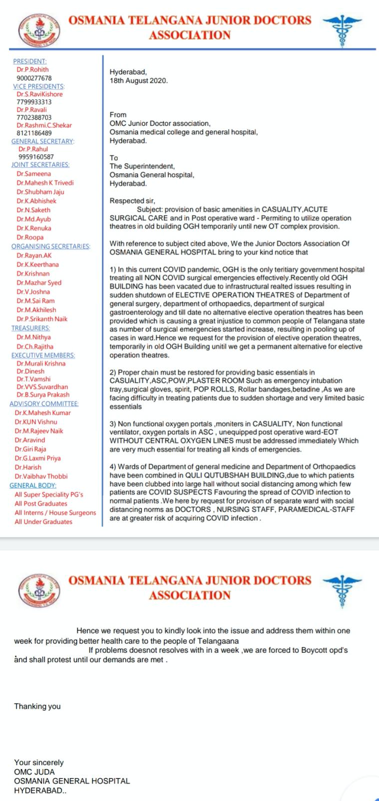 The junior doctors also expressed apprehensions over clubbing of patients from the various departments in a single hall on the fourth floor of Quli Qutb Shah building, a makeshift arrangement after these wards were evicted from the old heritage block recently. “A patient post his surgery, a trauma patient with a fractured leg, and those with general illness or seasonal diseases, or even pneumonia, are all housed in one hall. There could be some suspected of COVID-19, too. This is a high-risk scenario for all patients,” a junior doctor added. The letter also gives one week to the authorities to fix these issues and states junior doctors would be forced to boycott OPD’s and shall protest until demands are met with.
