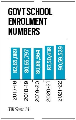 Apart from financial constraints faced by parents on account of Covid, experts and officials attributed the increase to government programmes. Secondary Education Director Saurabh Swami said, “First, SMILE and ‘Aao Ghar Se Sikhen (let’s learn from home)’ schemes had a huge impact. Through these programmes, we have ensured that education was not disrupted. We had online content created by our teachers. Second, we have been promoted to Grade 1+ category in a recent nationwide survey (Performance Grading Index). Third, our model schools and premier Mahatma Gandhi English Medium Schools have received great response from parents.”