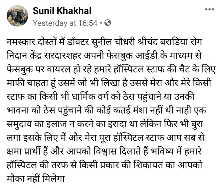 On Saturday, Dr Sunil Choudhary, who runs the Srichand Baradiya Rog Nidan Kendra, a private orthopaedic hospital in Sardarshahar, a town about 50 km west of Churu city, apologised on Facebook, saying his staff did not intend to hurt any religious group.