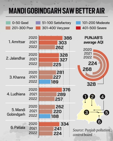 This year, the minimum of AQI 188 (moderate) was recorded in Mandi Gobindgarh, against last year’s 220 (poor) and 2020’s 262 (poor).