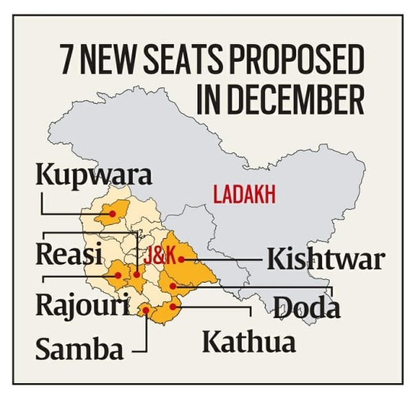 In December last year, the Commission, comprising retired Supreme Court judge Justice Ranjana Desai, Chief Election Commissioner Sushil Chandra and J&K Election Commissioner K K Sharma, proposed seven additional Assembly seats — six in Jammu division and one in Kashmir Valley.
