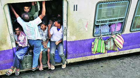 Passengers crowd the doorway of a local train on the outskirts of Kolkata Friday. (Source: AP)