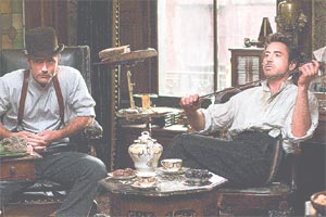 Ritchie,however,chooses to take things a step further. He exploresthe relationship in a very tongue-in-cheek manner. Robert Downey Jr (who plays Holmes) and Jude Law (Watson),as the promos establish,are unlike any other Holmes and Watson you have seen on screen before. Ritchies Holmes is a robust,sinewy,aggressive dude who packs in a mean punch or two (and also spends a considerable amount of screen time,bare-chested). This depiction is in direct contrast to the Holmes of the yorea wiry,pale man who hardly ever needed to grease his elbow. The bumbling,stocky Watson of the BBC series,was more of a comic relief than an able companion. But the casting of a pin-up icon like Jude Law as Watson,was most definitely coloured with some directorial motive. In Ritchies film Holmes hardly bumbles. On the contrary,he manages to rescue Holmes out of a sticky situation more than once. He also manages to look amazingly dapper in a three-piece suit (though he never takes his shirt off) and pouts every time Holmes disappoints him.