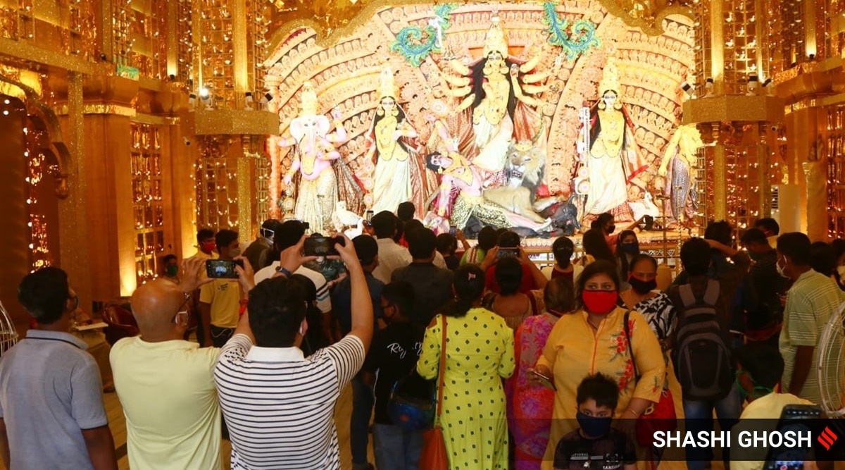 At Sreebhumi Durga puja pandal in Laketown in Kolkata on Monday (Express photo by Shashi Ghosh)