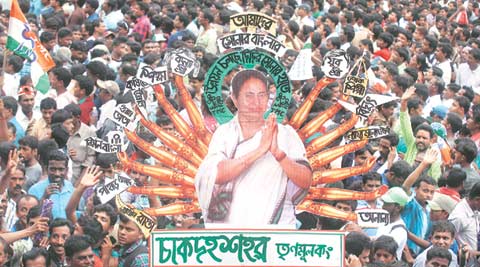 Supporters of TMC with a cut-out of Chief Minister Mamata Banerjee in Kolkata on Tuesday. (Source: Express photo by Partha Paul)