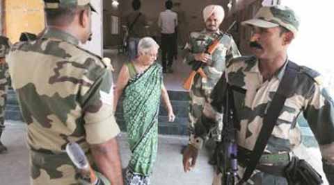 west bengal elections, west bengal polls, west bengal election 2016, 2016 elections, indian express elections, bidhannagar, north 24 parganas Central forec stands guard outside AB block abasik Sangha polling booth during polling on Monday at Salt lake , Kolkata. some of residents of the area who had been either victims and witnesses of violence on that day.Express photo