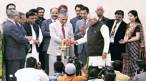 Chief Justice of India T S Thakur with Allahabad High Court Chief Justice D Y Chandrachud, Governor Ram Naik and Chief Minister Akhilesh Yadav at the inauguration of the new building of the Allahabad High Court’s Lucknow Bench on Saturday. Vishal Srivastav