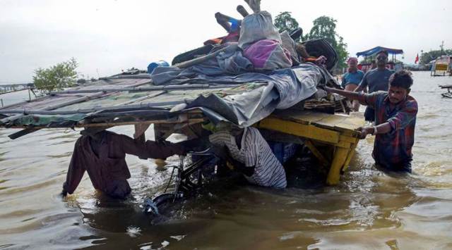 Prayagraj: Flood-affected residents of a low lying area on the banks of the River Ganges carry their belongings through floodwaters as they move to a safer place, in Prayagraj (Allahabad), Sunday, Aug 18, 2019. (PTI Photo)