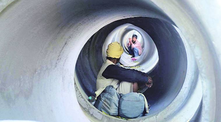 Homeless people take shelter inside a hume pipe, in Lucknow on Saturday amid the nationwide lockdown. (Express Photo by Vishal Srivastav)
