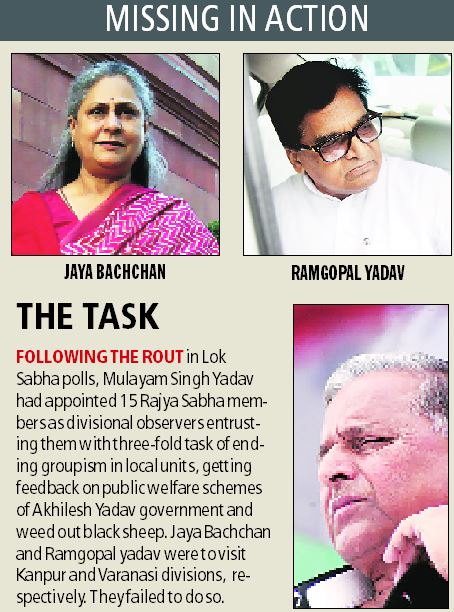 Following the rout in the Lok Sabha elections, Mulayam, on December 24 last year, appointed 15 Rajya Sabha members as divisional observers entrusting them with three-fold task of ending groupism in local units, getting feedback on public welfare schemes of Akhilesh Yadav’s government and hold meetings with district level office bearers and interact with public in absence of local leaders to collect feedback about the black sheep in SP who sabotaged party’s prospects in Lok Sabha polls.
