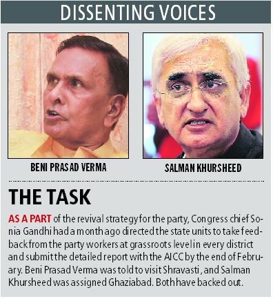 Union ministers Beni Prasad Verma and Salman Khurshid have backed out from shouldering a responsibility that was assigned to the party’s state units by AICC chief Sonia Gandhi.