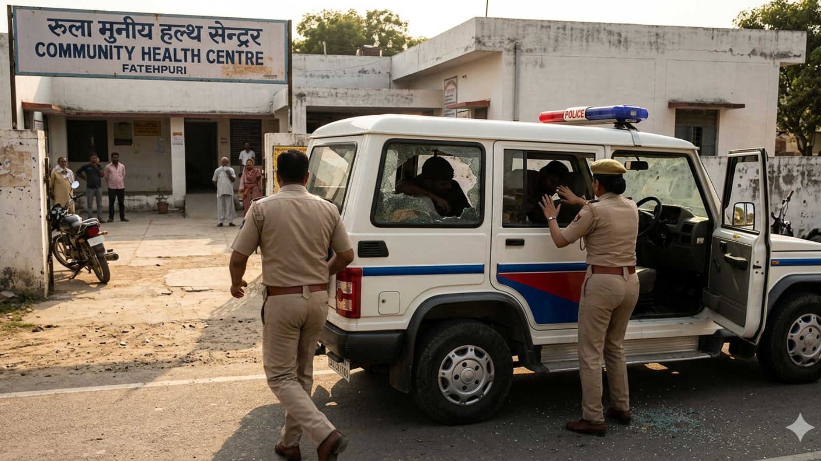 The attack took place while the woman was in a police vehicle outside a community health centre (CHC). The victim, identified as Rakhi, is in critical condition and has been referred to a specialised medical facility for advanced care.
