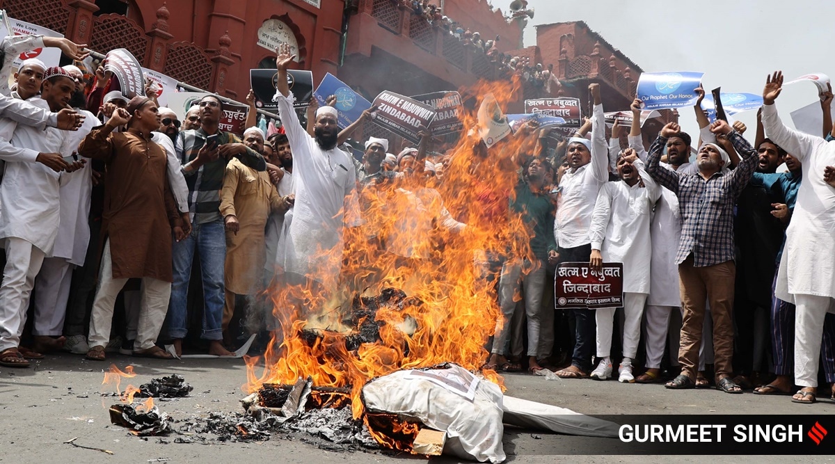 Protesters burn effigies during an agitation against the remarks on Prophet Mohammad by ex-BJP spokespersons, outside the Jama Masjid in Ludhiana on Friday. (Express Photo by Gurmeet Singh)Protests were held by Muslim organisations across Punjab after Friday prayers on a call by the Shahi Imam of Jama Masjid, Ludhiana, over the controversial remarks of BJP leaders Nupur Sharma and Naveen Kumar Jindal against Prophet Mohammad.