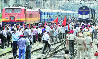 The trains were stopped for about an hour and a half from 12.15 pm to 1.40 pm. The union members sat on the railway line crossing near Jagraon bridge.