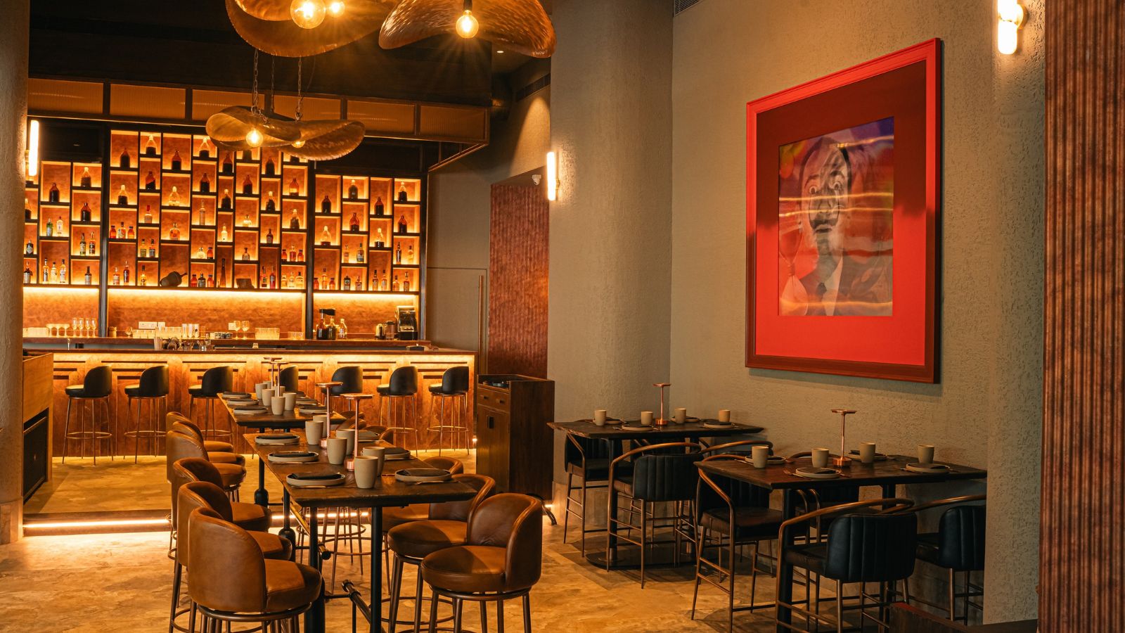 At this 120-seater, seating ranges from high chairs to plush mahogany leather sofas, all bathed in amber-hued lighting. The deep maroon marble bar framed with tarnished copper is the dramatic centrepiece, as is the lenticular artwork that shifts between Salvador Dalí and John Lennon — a playful, slightly surreal welcome that reveals itself through the evening, alongside witty lines etched onto glasses (“We are just getting started”) and tables (“Come as you are”). There’s also a breezy al fresco section. The space allows you to unwind without feeling the need to decode the science behind your drink — it’s technique-forward without being intimidating.