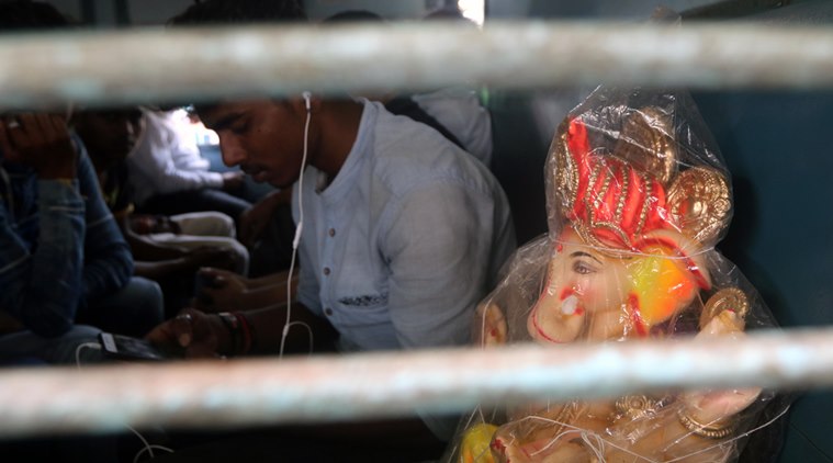 A Ganesh idol being taken in a train from Dadar station. (Express phoot by Ganesh Shirsekar)