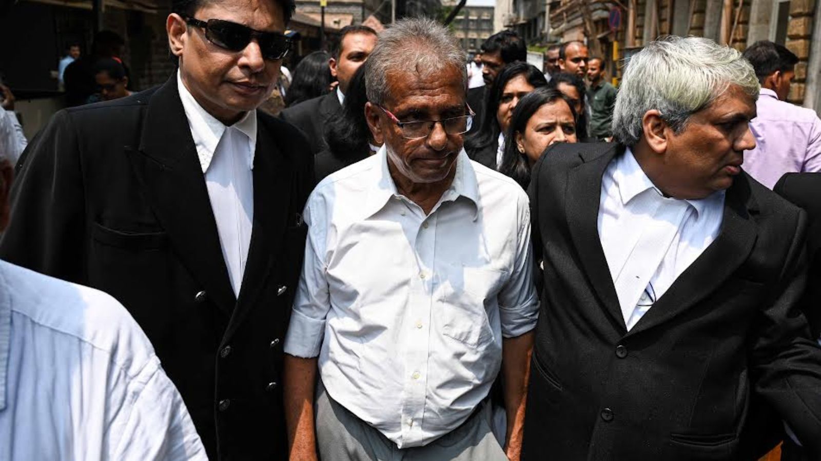Disha Salian’s father, Satish Salian and the lawyers come out of the High Court in Mumbai.