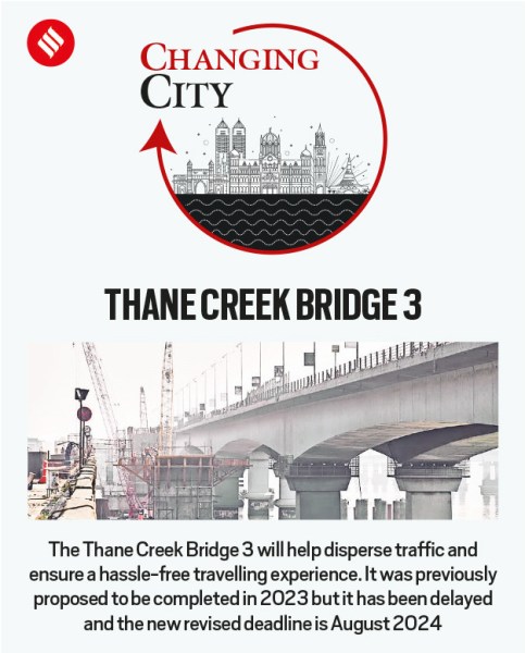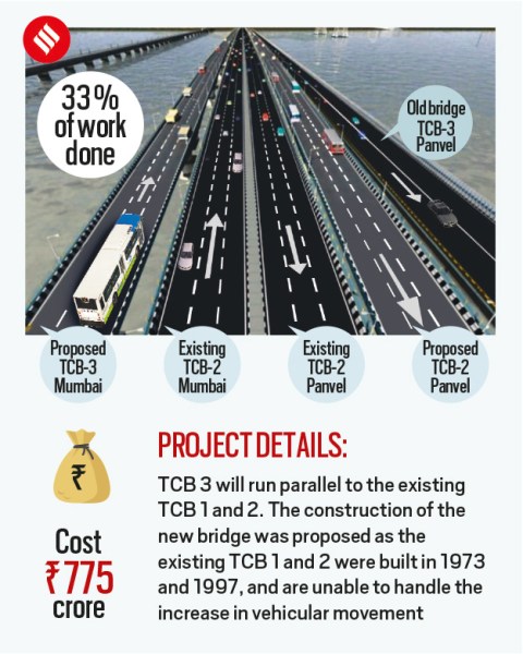 The Maharashtra State Road Development Corporation (MSRDC) is undertaking the Thane Creek Bridge (TCB) 3 construction work. The project was initiated to decongest the traffic from the existing TCB 1 and 2 since an international airport is coming up in Navi Mumbai. This new bridge, once ready, will ensure smooth traffic movement and hassle-free connectivity between the twin cities — Mumbai and Navi Mumbai.