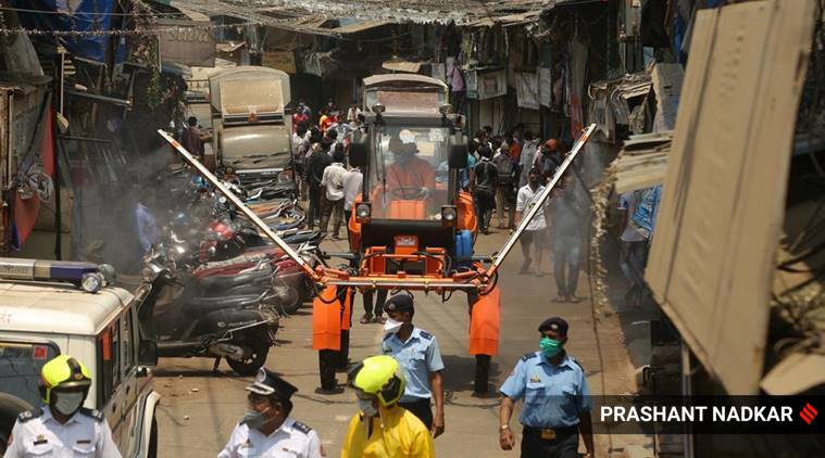 In Dharavi, Mumbai Fire Brigade sprays disinfectant on Sunday. COVID-19 cases have been found in the slum. (Express Photo: Prashant Nadkar)
