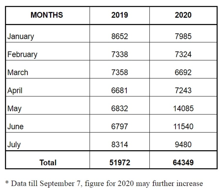 In March, Mumbai’s total 6,692 deaths were lower than the 7,358 in 2019. But since April the overall deaths have been steadily climbing, from 7,243 in April to 14,085 in May, 11,540 in June and 9,480 in July.