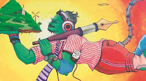 Among several wall-paintings at the institute’s student activity centre, was one of a man carrying a mountain in one hand and holding a pen instead of a mace in the other.