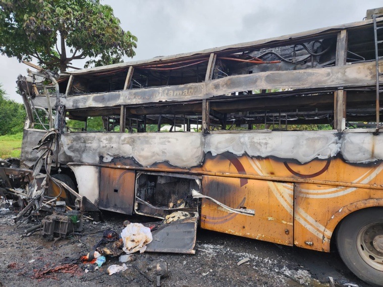 The truck’s driver is absconding.” While many escaped by breaking the emergency doors and windows, 10 men, one woman and the three-year-old girl were charred to death inside the bus.