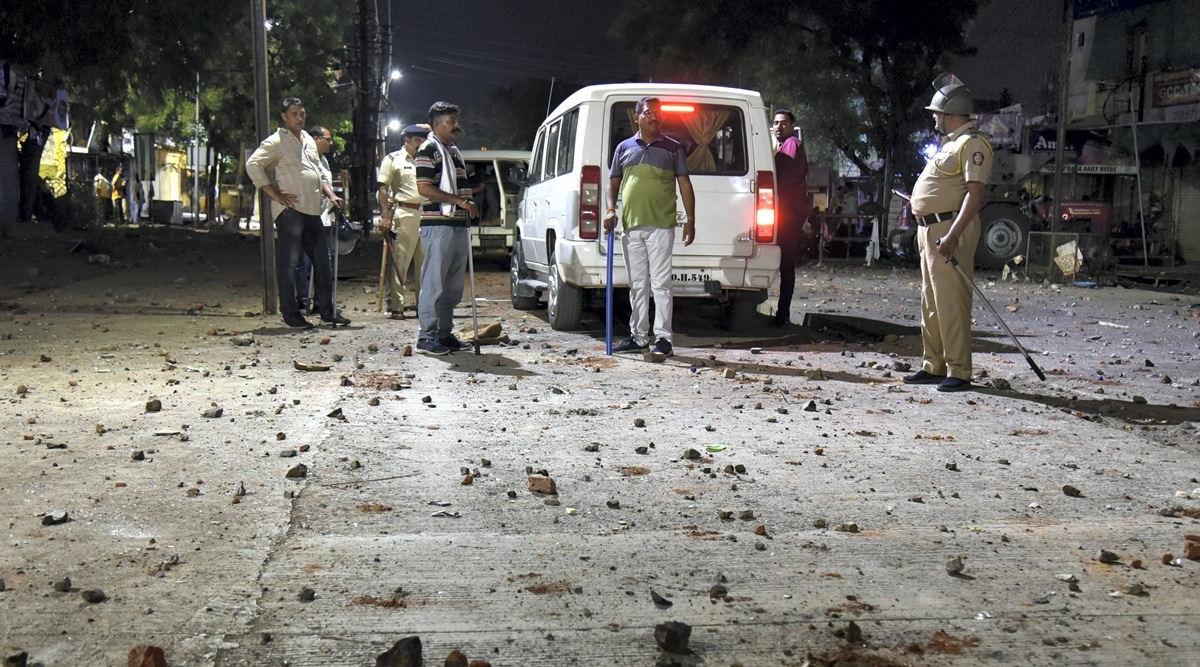 Police personnel at the site of a clash in Akola, Maharashtra, Saturday night. Two cops were among the eight injured. (PTI)