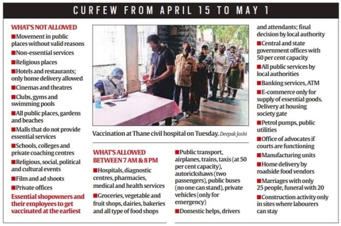 The Maharashtra government on Tuesday announced a 15-day statewide curfew from Wednesday amid the spike in coronavirus cases in the state. The curfew, which exempts essential services, will come into effect from 8 pm on Wednesday.