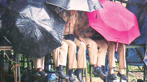 Police officers take shelter from rain under a tent put up by protestors at Azad MaidanMumbai, especially the suburbs, received heavy rainfall throughout Tuesday, causing traffic snarls in various areas. The India Meteorological Department (IMD) has issued a warning of heavy rainfall for Wednesday in the city and the suburbs.