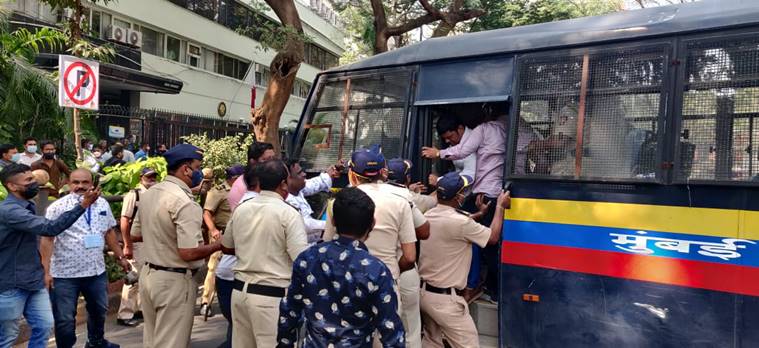 Workers of the Vanchit Bahujan Aghadi were stopped at 10 metres away from the Vidhan Bhavan gate at Nariman Point in South Mumbai. They were protesting to demand reservation for OBCs in local self election.