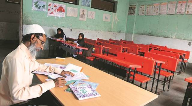 An almost empty classroom at Sanjay Nagar Municipal Urdu School on Saturday. (Express photo by Prashant Nadkar)