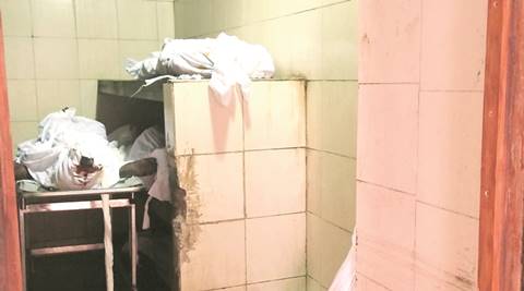 With space crunch, bodies in St George mortuary are kept folded by the doorway or piled on top of one another. Express photo