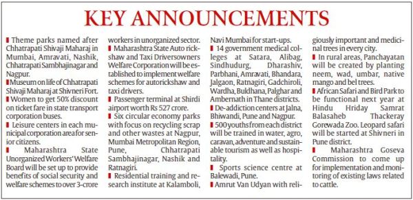 In his Budget speech, Fadnavis said, “As the country moves towards 5 trillion dollar economy, Maharashtra too has decided to contribute its share of 1 trillion dollar economy. To boost state share from 14.2 per cent to 20 per cent in the national gross domestic product, our emphasis is to boost infra creation, which will result in comprehensive development of the state.” While the budget committed an overall outlay of Rs 53,058.55 crore for infrastructure development in the state, it stated that Rs 19,491 crore has been proposed under scheme expenditure for Public Works Department, Rs. 8,490 crore for Rural Development and Panchayat Raj Department, and Rs 10,297 crore for Planning and Employment Guarantee Scheme Department in the year 2023-24.