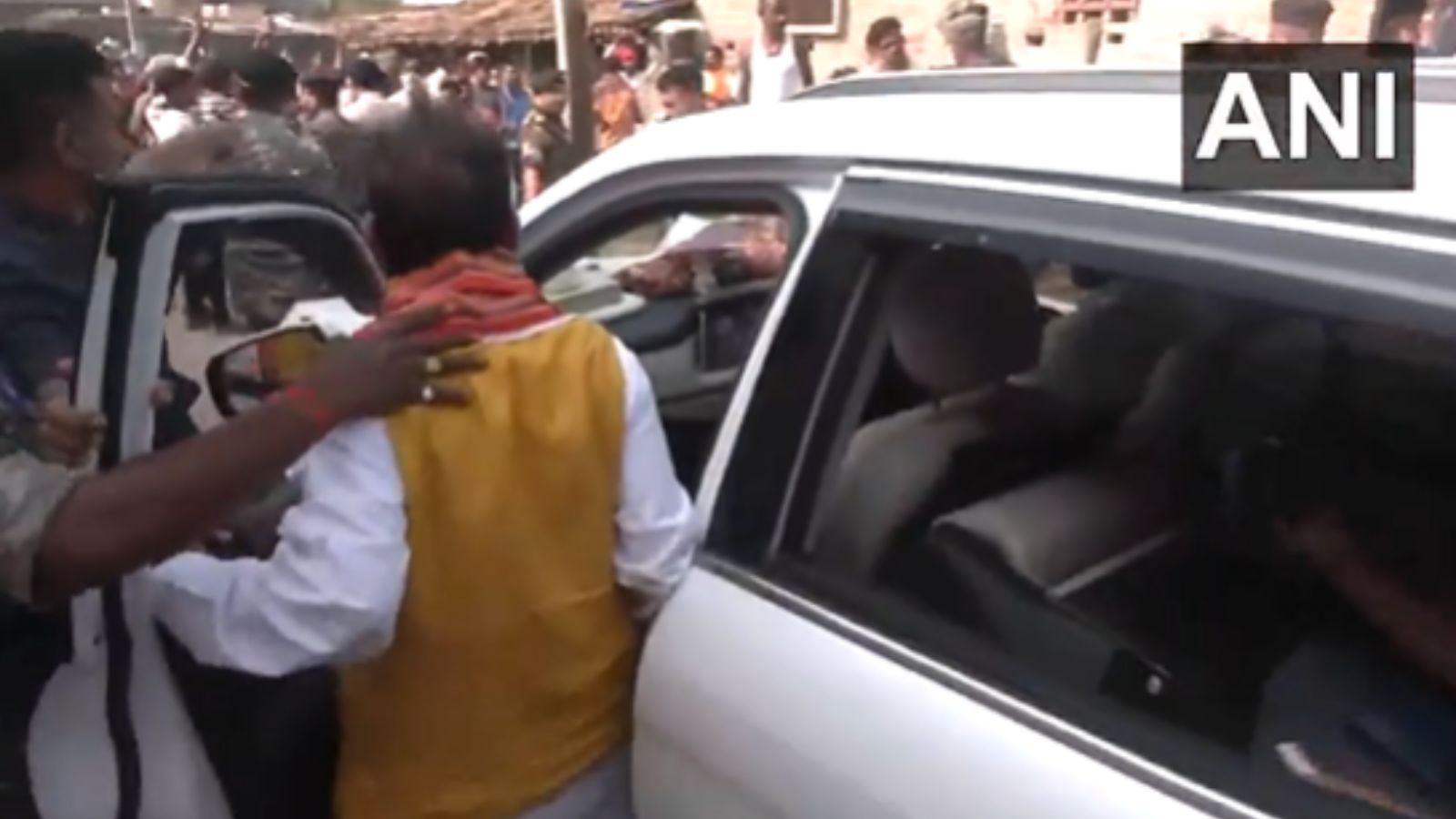 Bihar Deputy Chief Minister and BJP candidate Vijay Sinha’s convoy was attacked Thursday when he tried to enter Khoriari village in Lakhisarai Thursday. Visuals from the scene showed a mob surrounding his car and hurling slippers, while shouting ‘murdabad‘ slogans.
