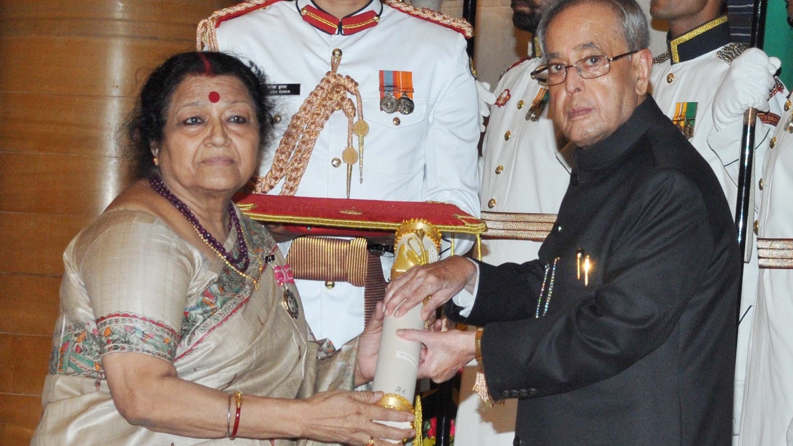 The President, Shri Pranab Mukherjee presenting the Padma Shri Award to Smt. Ushakirna Khan, at a Civil Investiture Ceremony, at Rashtrapati Bhavan, in New Delhi on March 30, 2015. (Image source: Wikidata)