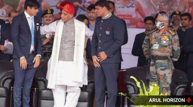 Defence minister Rajnat Singh and Army Chief General Manoj Naravane during the felicitation of Olympic gold medal winner Neeraj Chopra at Army Sports Institute (ASI) on Friday.