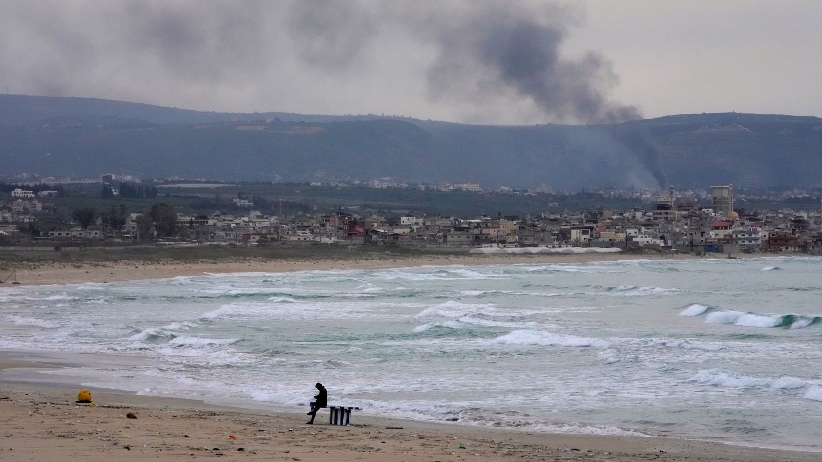 A man checks his phone on a beach as smoke rises from Israeli artillery shells on Qlaileh village, visible from Tyre city, south Lebanon. (Photo: AP)