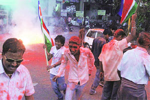Supporters of winning candidates flouted the restrictions imposed by the city police on taking out processions and bursting crackers.