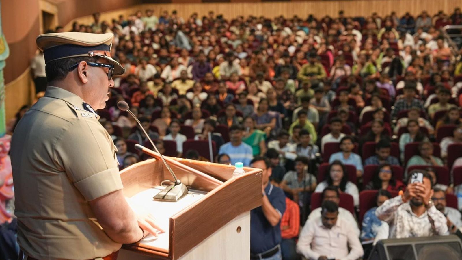 Pune Police Commissioner Amitesh Kumar addresses students during a special public awareness program under the Nasha Mukt Bharat Abhiyan at Modern College on Wednesday. Express photographs by Arul Horizon