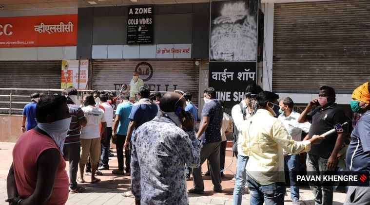 People queuing outside an alcohol store in Pune before it opens. (Express photo by Pavan Khengre)