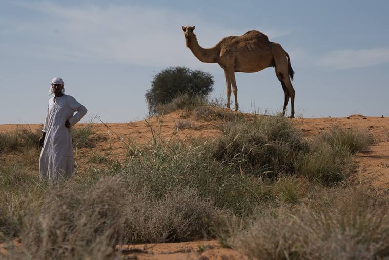 A shepherd and his camel look out into the distance in Umm al-Quwain, United Arab Emirates, Saturday, April 18, 2020. Recent rain showers have seen scrub and brush grow in parts of the UAE’s vast deserts. (AP Photo/Jon Gambrell)